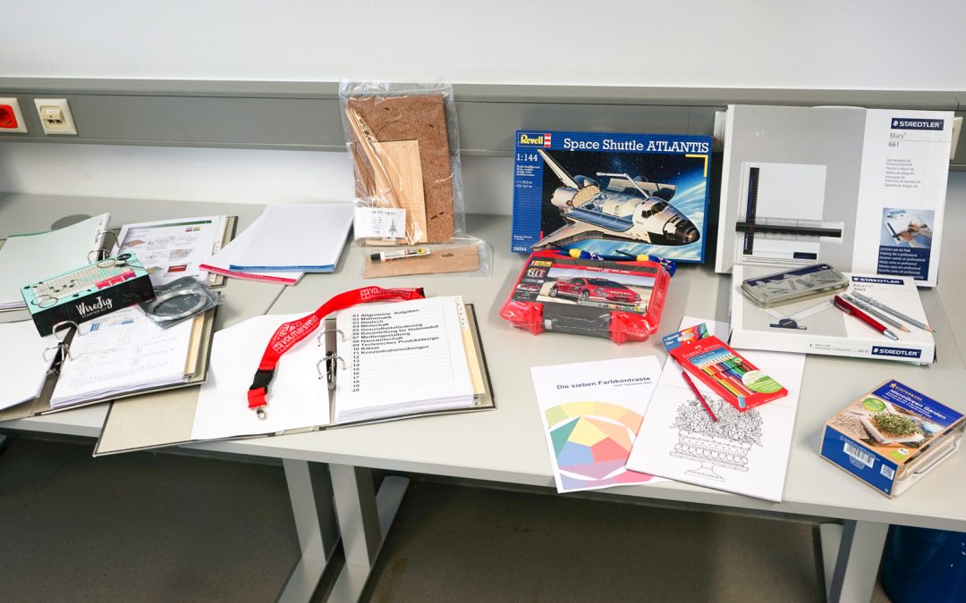 Heraus kam ein Arbeitsordner mit den unterschiedlichsten Aufgabenstellungen – von Mathematik über Konzentrations- und Entspannungsübung bis hin zu fachbezogenen Aufgaben z.B. zur Mediengestaltung und zu technischem Produktdesign. Zusätzlich zu diesen theoretischen Aufgaben bestückten die Ausbilder*innen das Paket mit Gestaltungsaufträgen, Drahtbiegeübungen, einer Kräuteraufzuchtbox und anderen praktischen Aufgaben, wie z.B. Bausätzen von Revell.